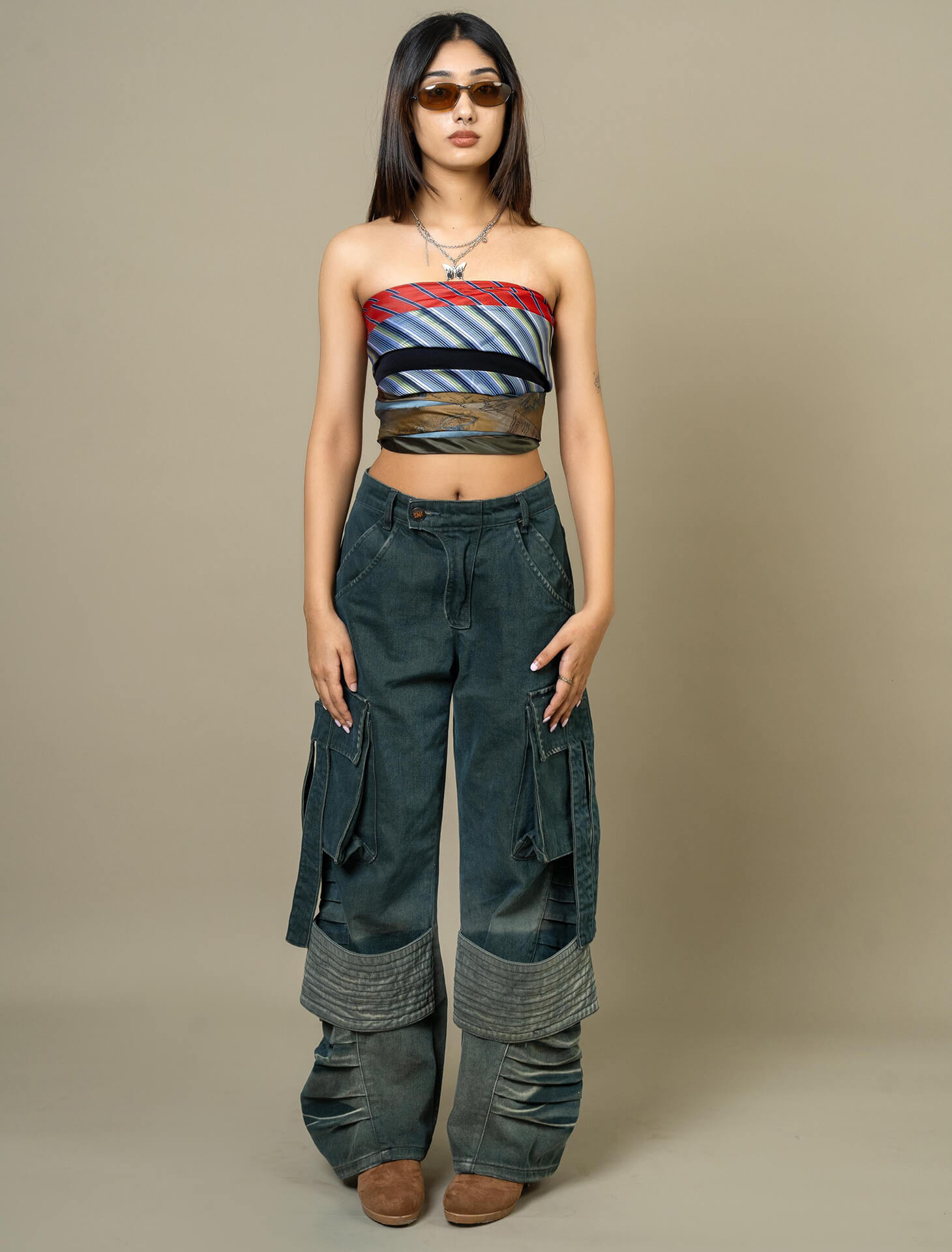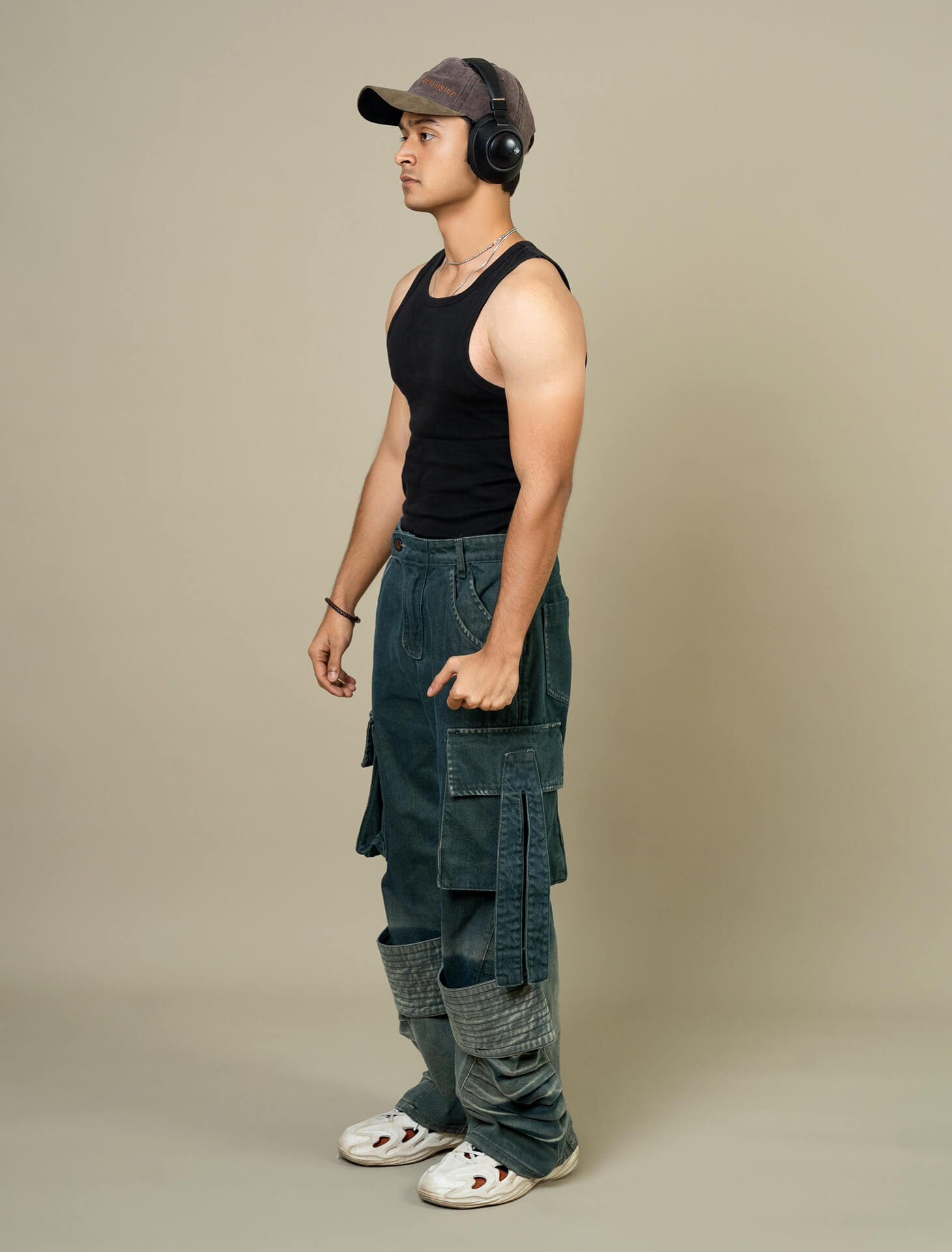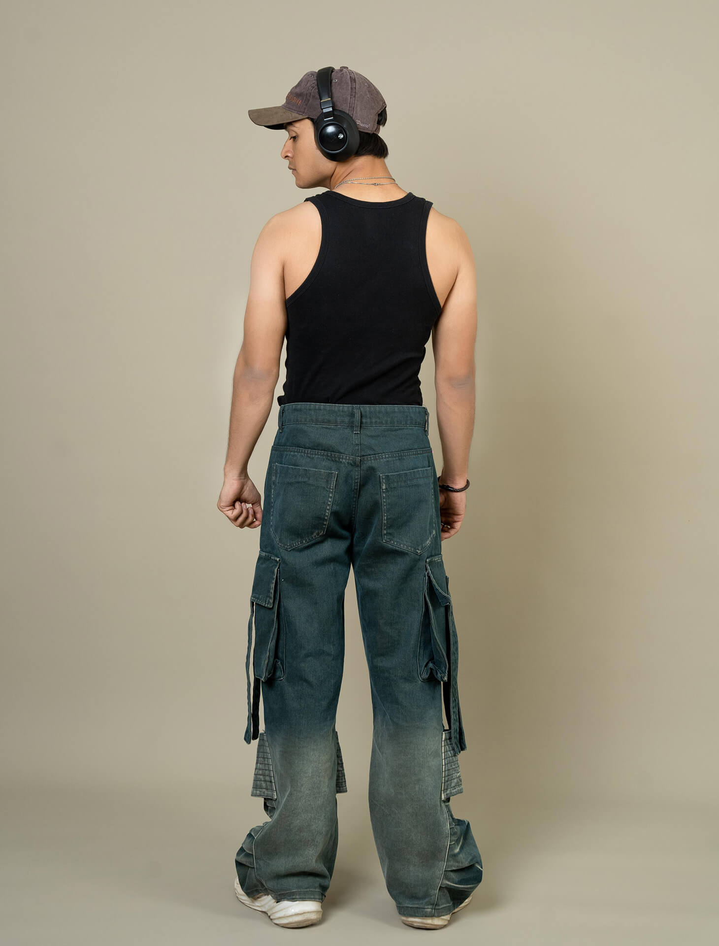 Heavyweight vintage green Denim with double flap pockets, pleated panels, and structured stacked legs. Finished with raw hems and reinforced seams for a bold, built look. 100% cotton twill Relaxed fit