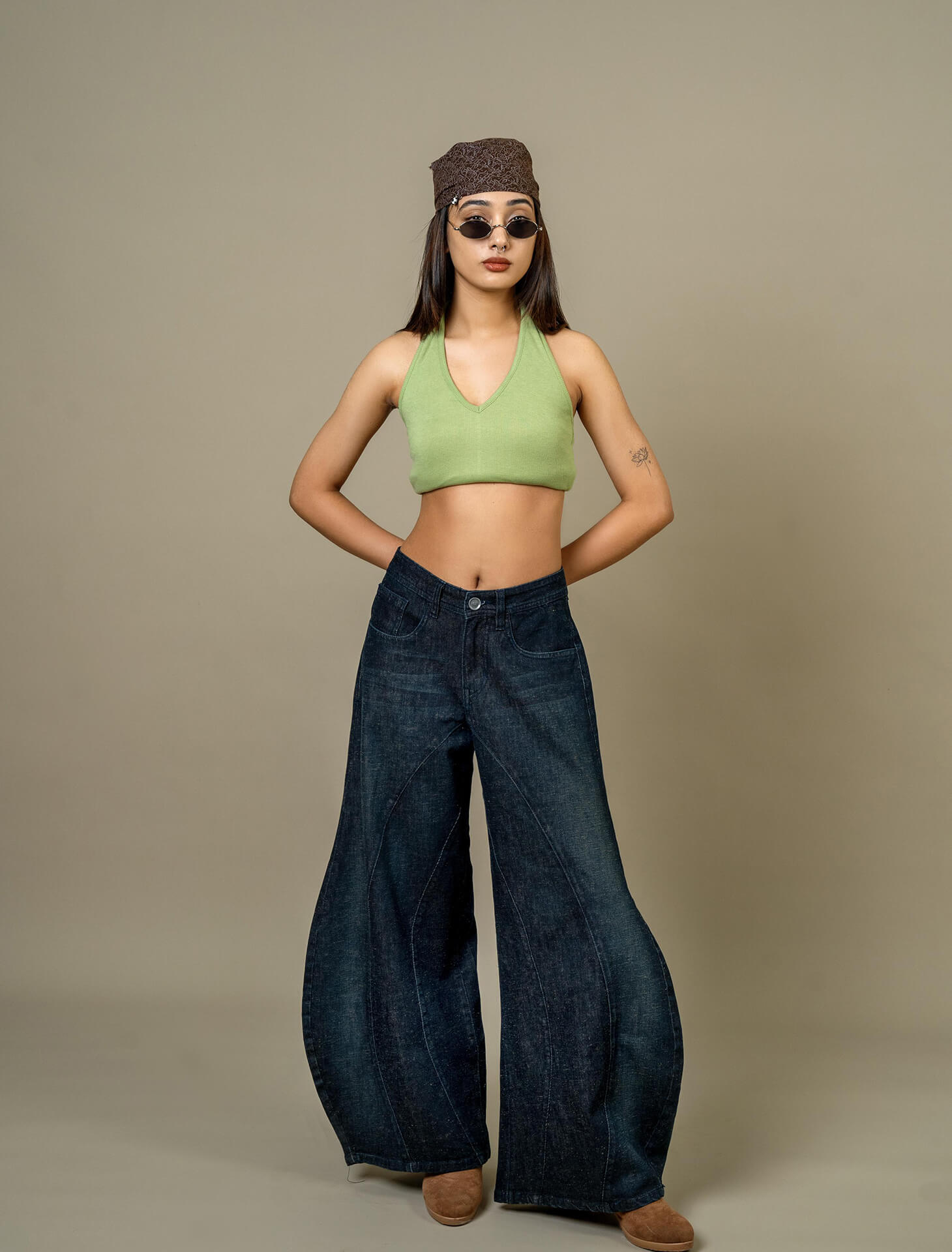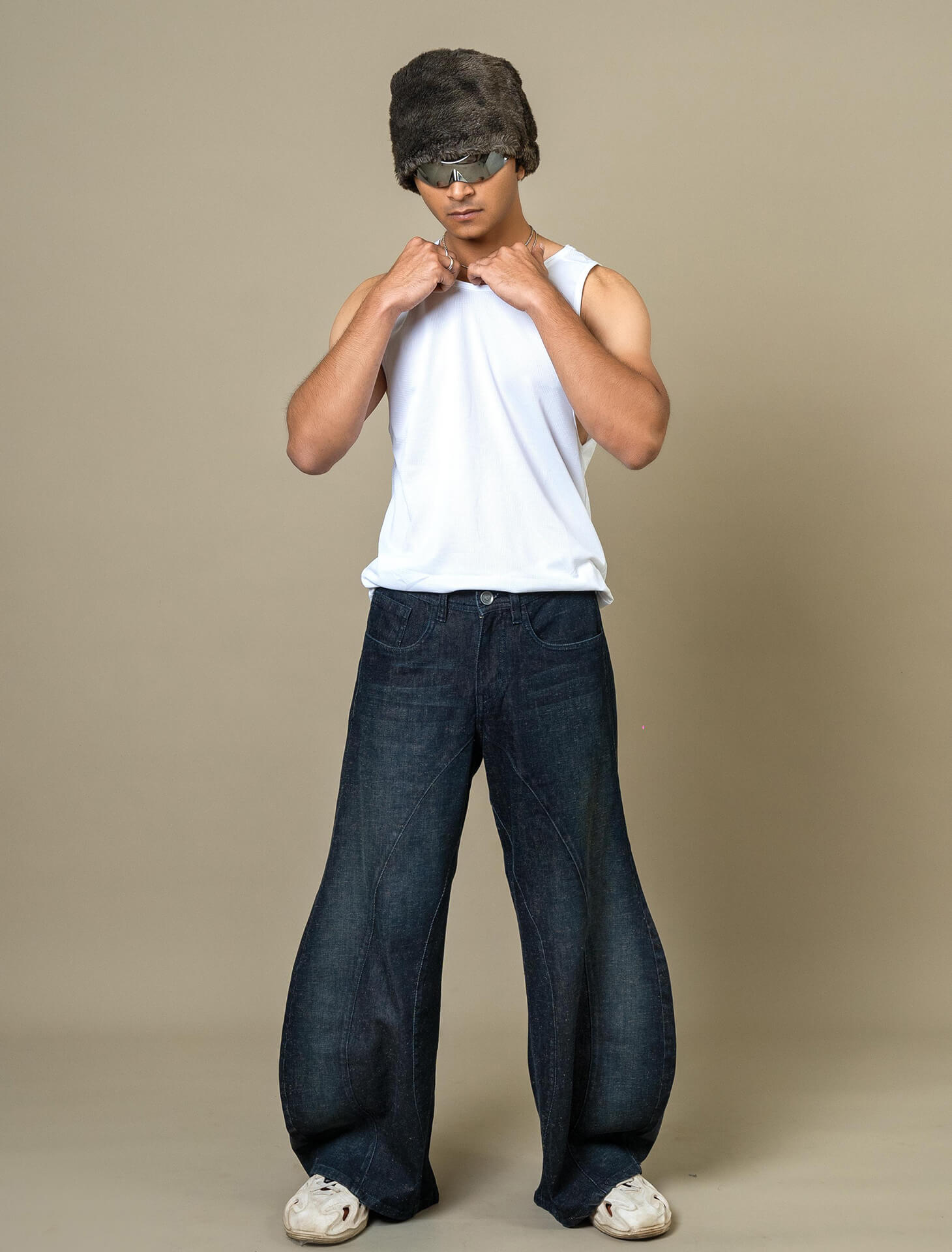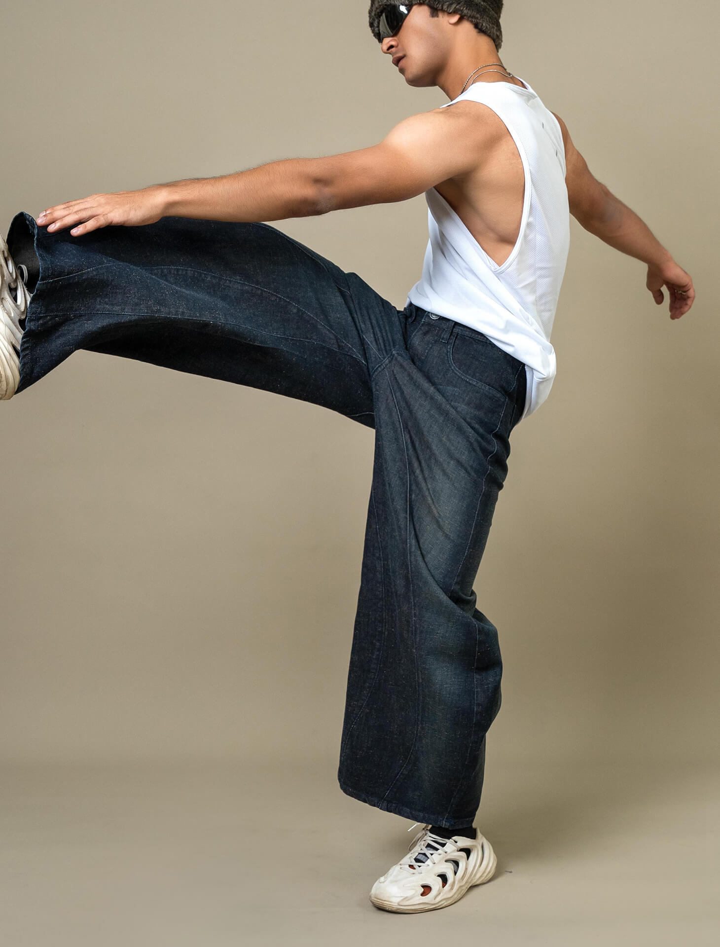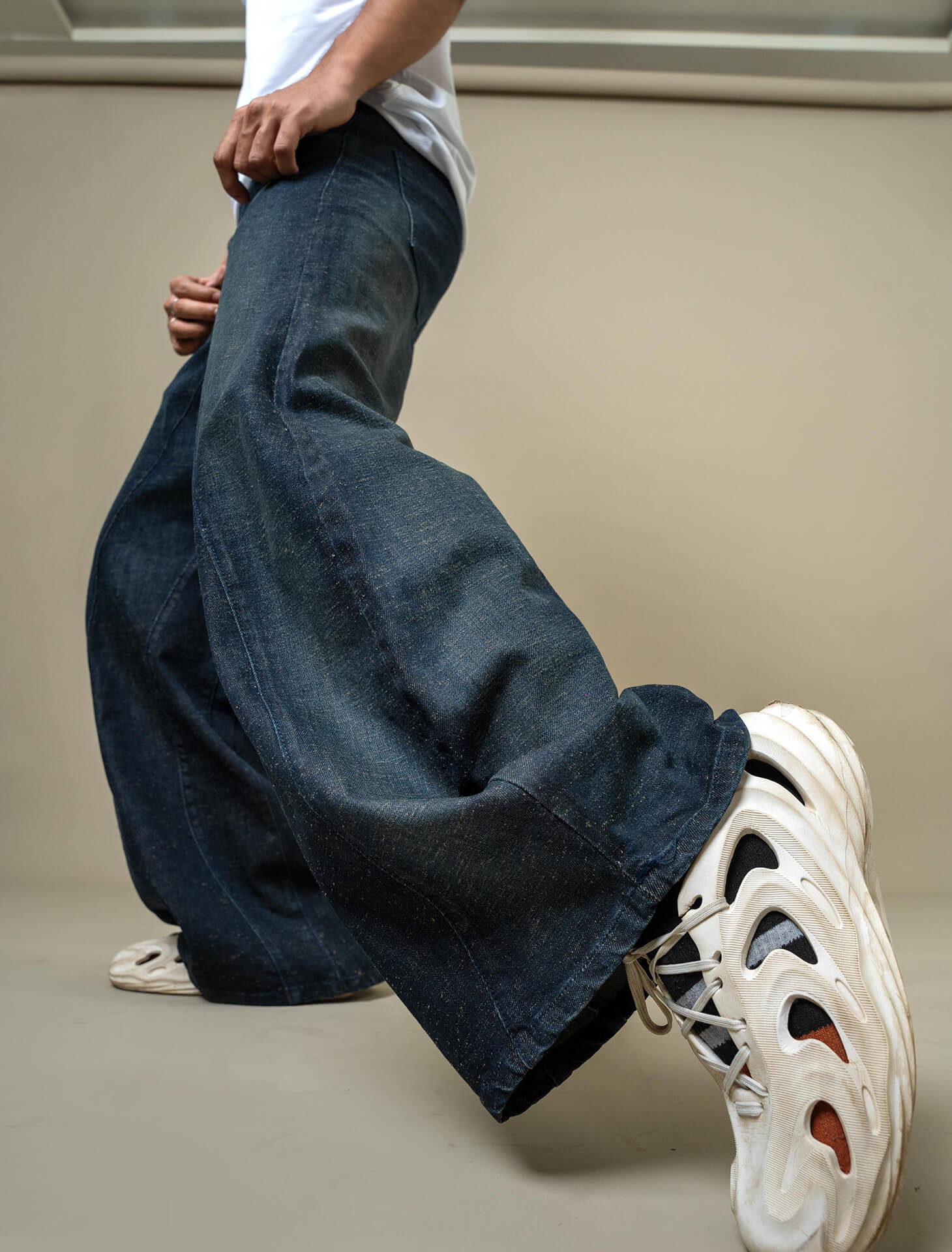 Barrel-shaped raw denim with deconstructed outseams and a bold curved silhouette. Designed to stand out while staying structured. 100% cotton