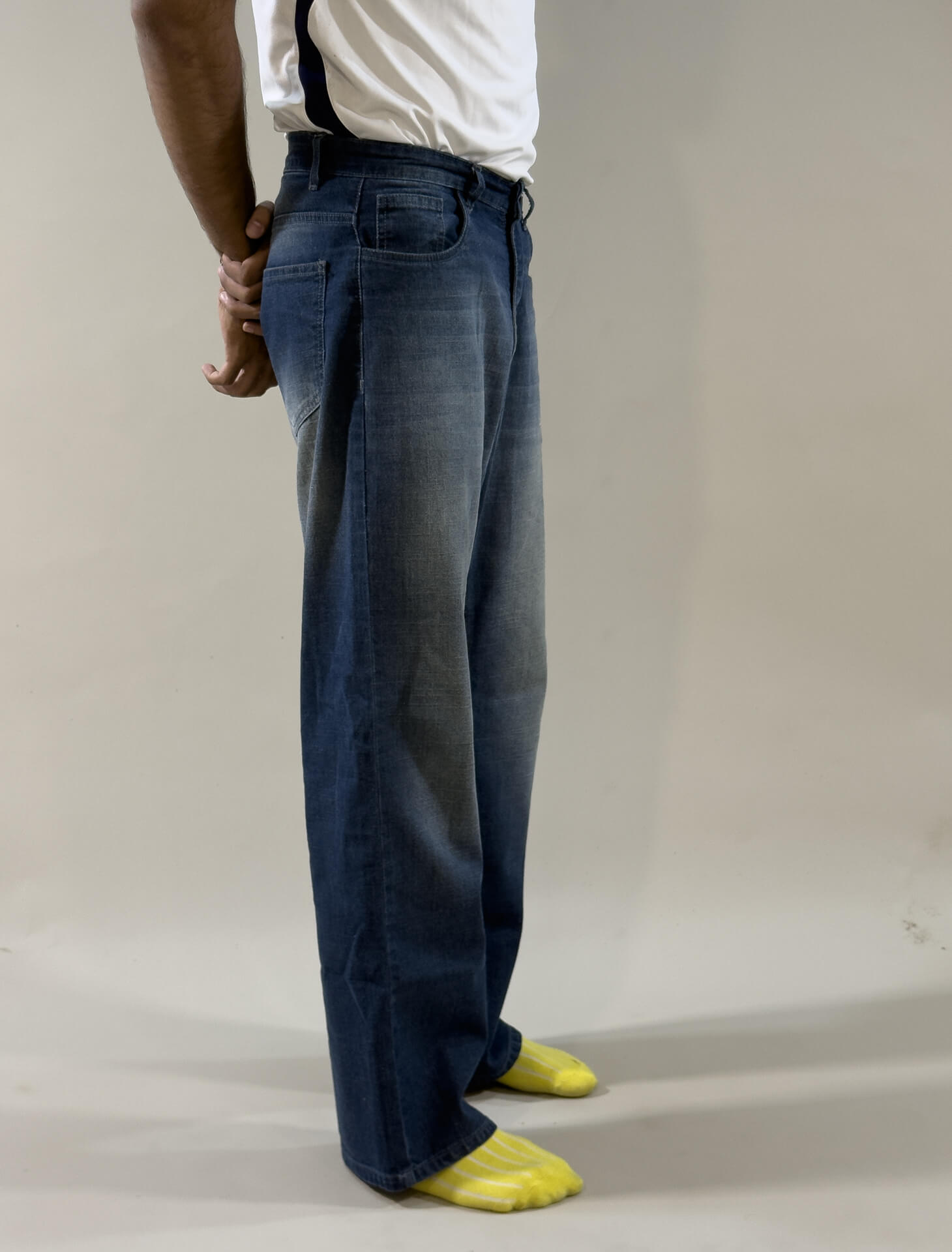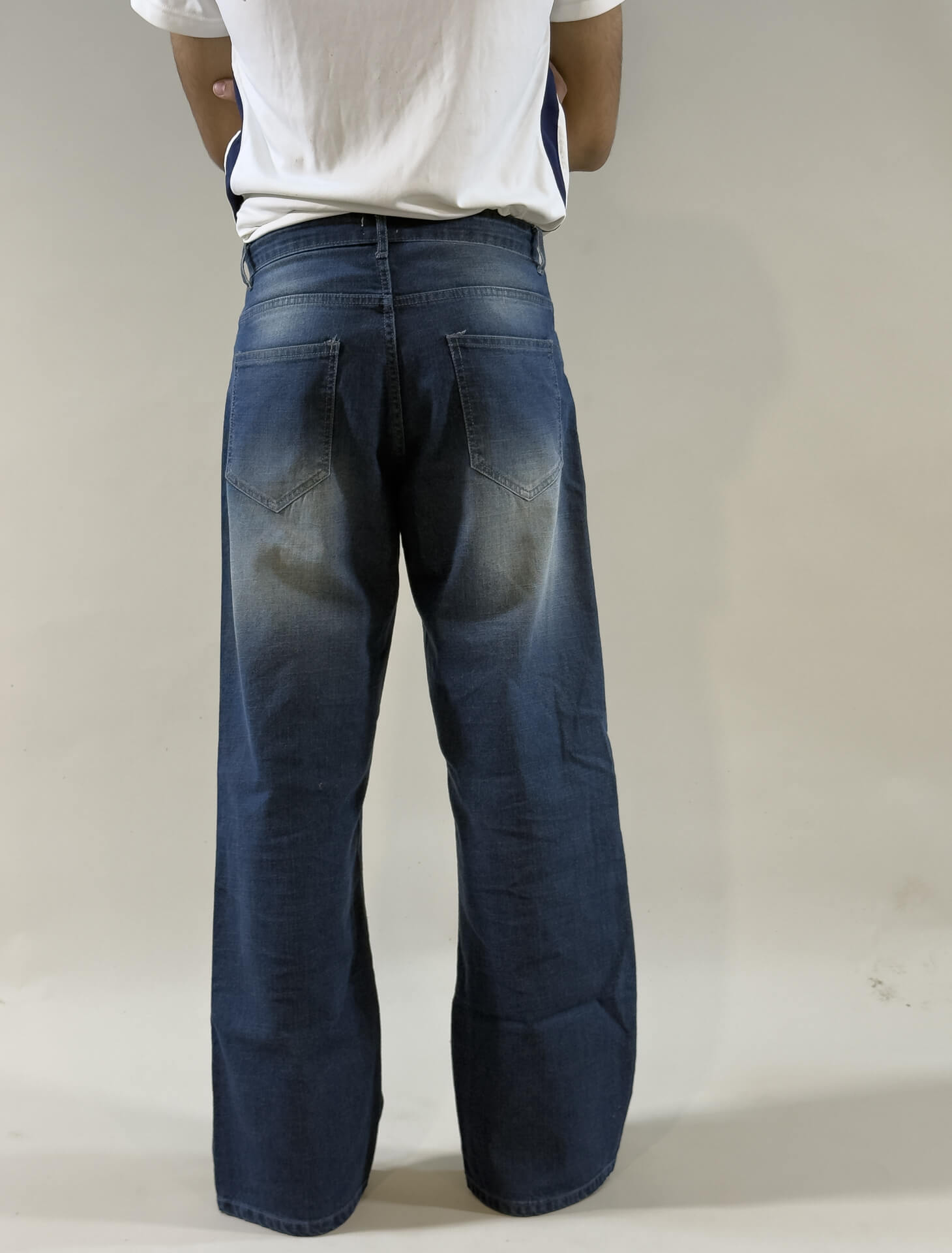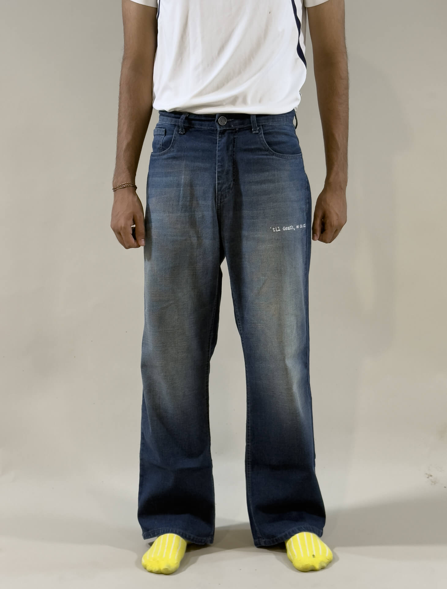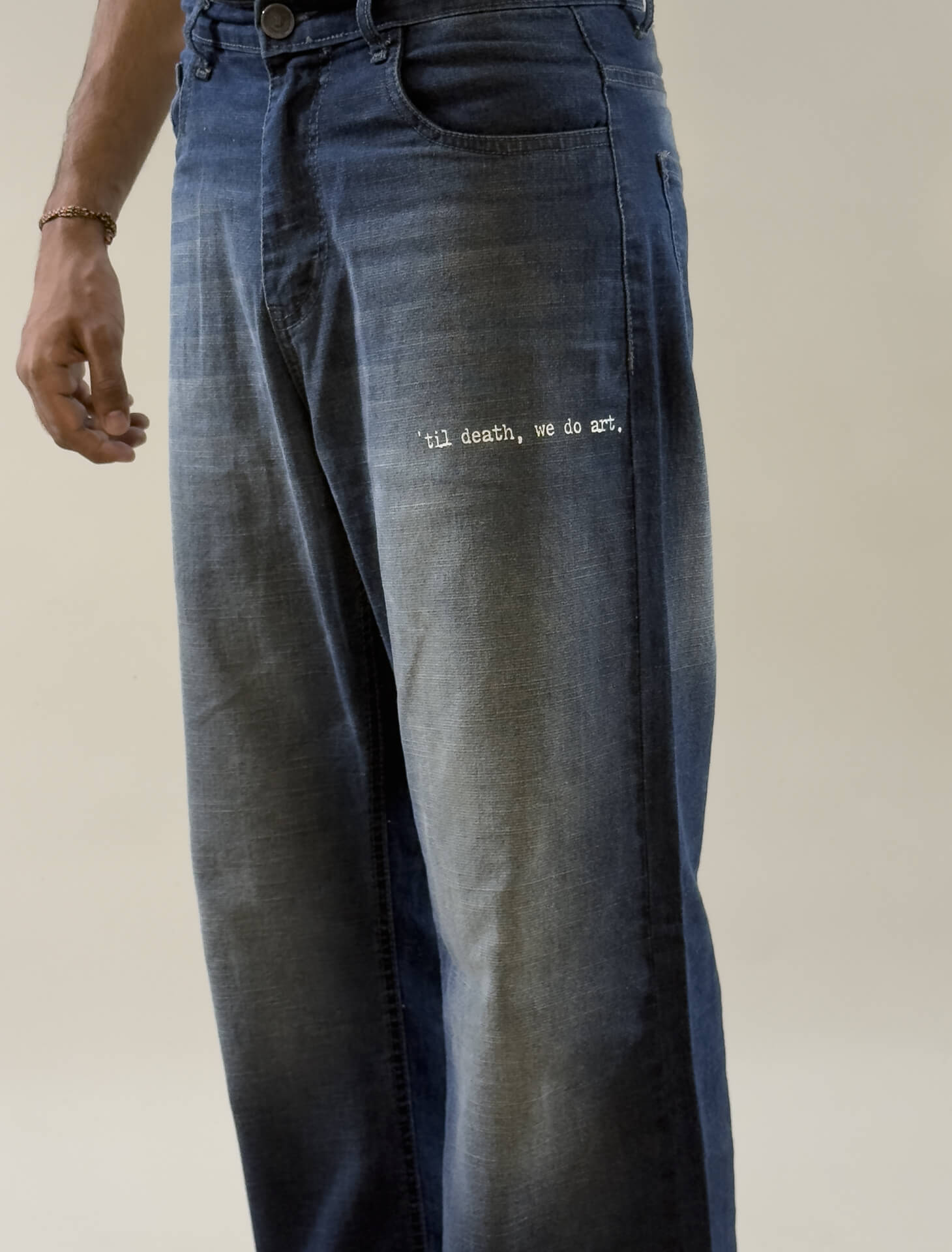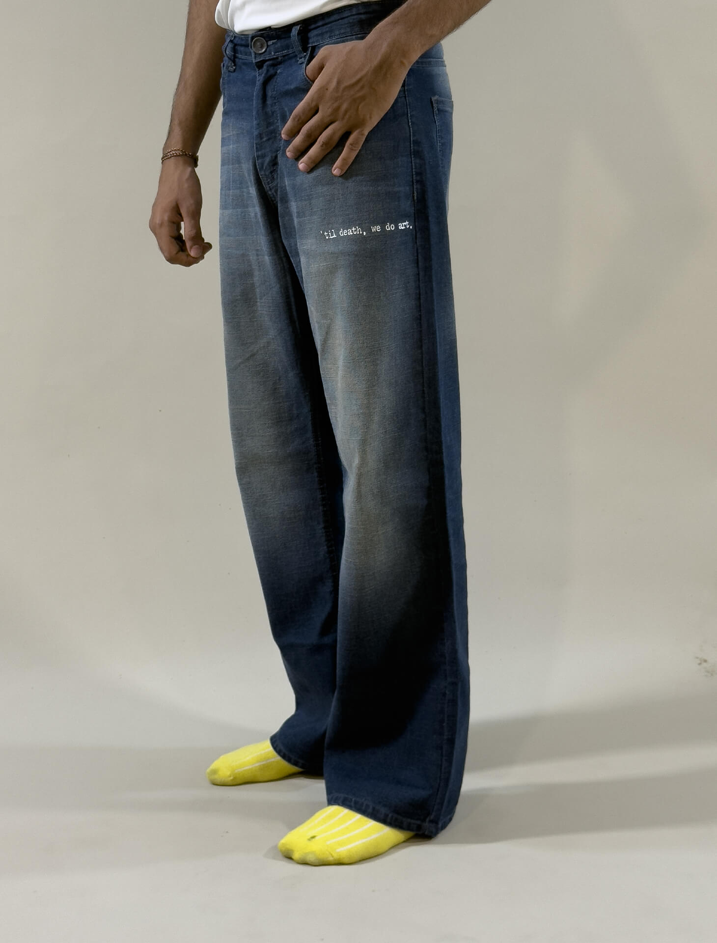 Classic blue denim, washed and worn to perfection. Features panel detailing and a straight-leg silhouette that carries edge without effort. Til death we do art.